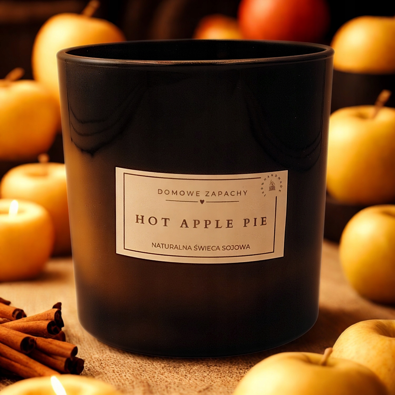 Świeca HOT APPLE PIE to zapach świeżo upieczonego ciasta z jabłkami, cynamonem i nutą wanilii. Naturalna, ręcznie robiona w Polsce, zamknięta w eleganckim czarnym szkle z połyskiem, z 2 bawełnianymi knotami – idealna na chłodne wieczory i rodzinne chwile pełne ciepła.